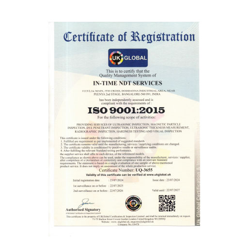 Our state of art in NDT combined with more than 20 years of field experience in most of all sectors like Fabrication, Foundry, Forging, Earthmoving, Process Industries, Petrochemicals, Cross Country Pipelines, Manufacturing industries, Pressure vessels, Boilers, Aeronautical etc. IN-TIME NDT are more emphasis on mainly three strengths i.e. in-time services backing up with accurate results and very affordable service charges as compare to any other NDT Service providers.